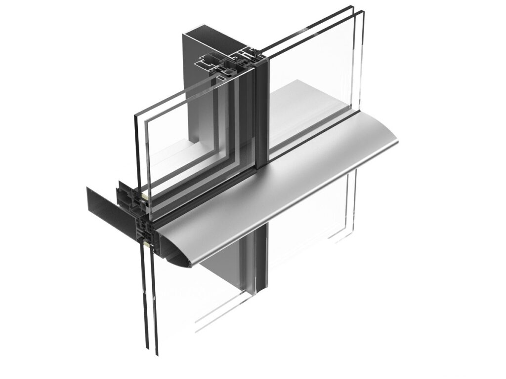 Fachada ligera AL 50 MIXTO HORIZONTAL, que combina tapetas horizontales y juntas verticales selladas. Ofrece aislamiento, eficiencia energética y luminosidad, con posibilidad de aperturas proyectantes y montaje seguro mediante sus anclajes y perfiles adaptables.